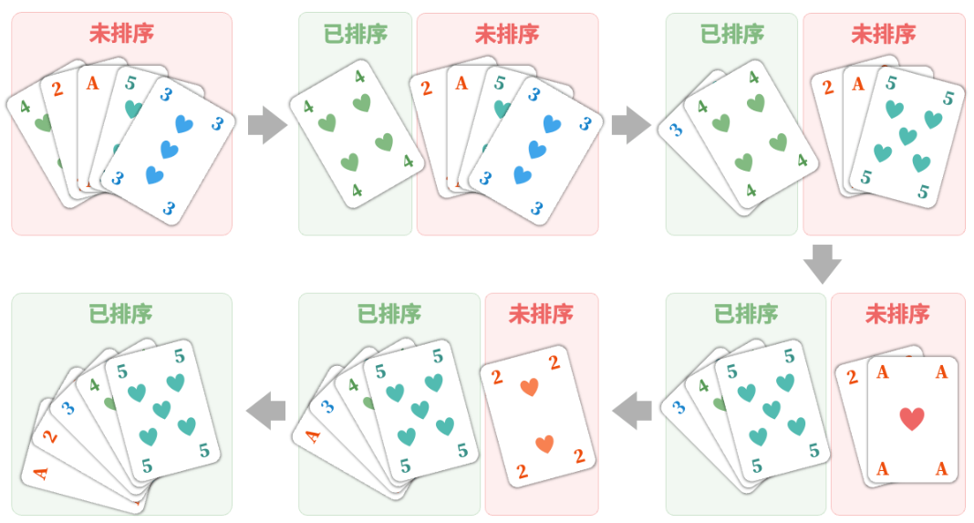 - 3.不断循环步骤 2. ,每一轮将一张扑克牌从无序部分插入至有序部分,直至所有扑克牌都有序。