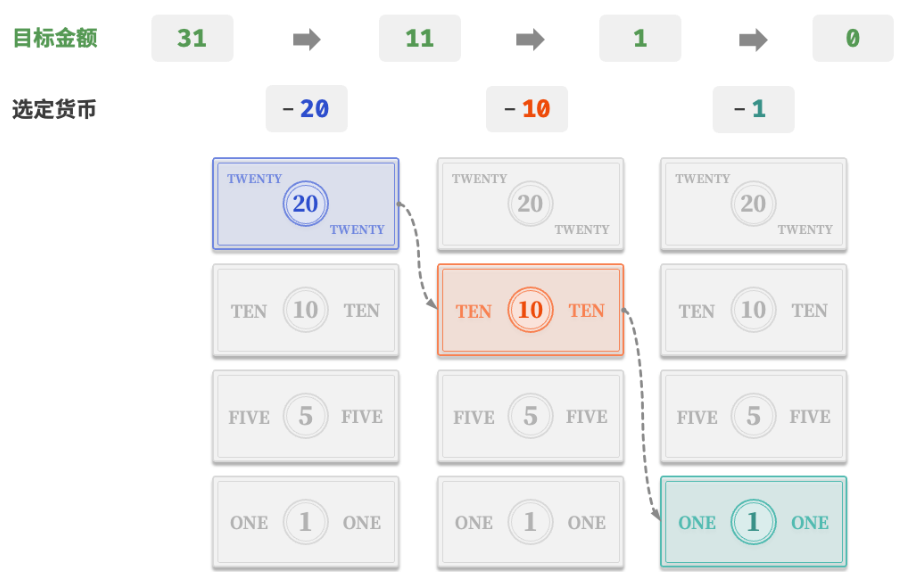 - 货币找零的步骤本质上是贪心算法,每一步都采取当前看来最好的选择。